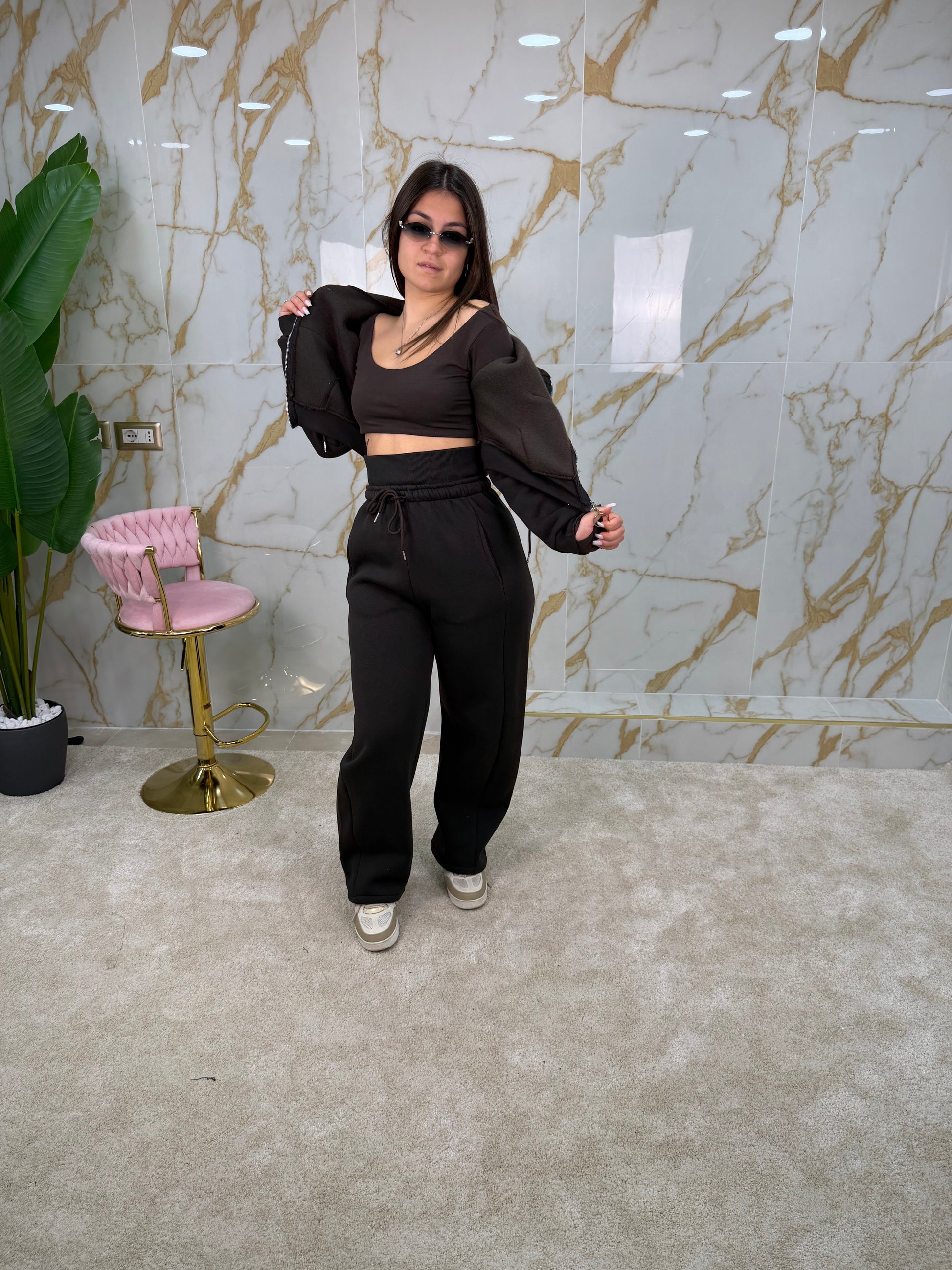 Tuta felpata tre pezzi con pantalone, top e giacchetta zip con cappuccio. Comoda, calda e perfetta per un look casual e versatile.